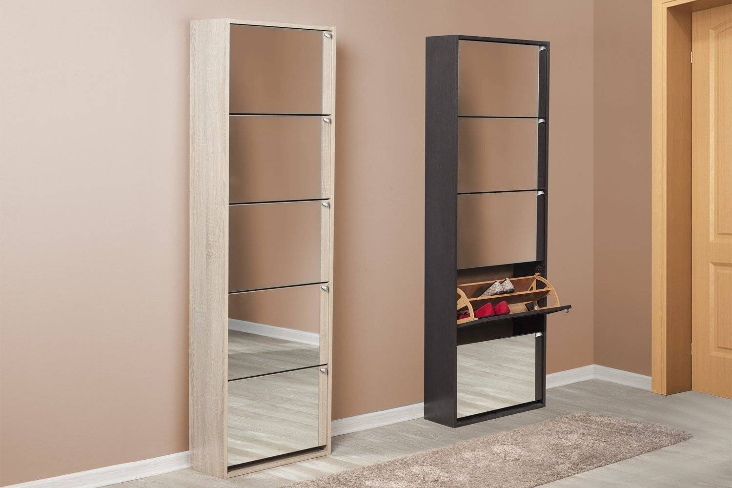 - На лицевой панели обувного шкафа можно повесить зеркало, без которого в прихожей просто не обойтись.