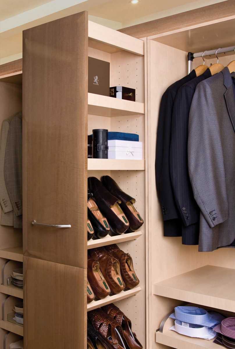 Если в прихожей все же нет места для отдельного хранения обуви, его можно устроить в шкафу-купе. Для этого один отсек оборудуется стационарными или выдвижными полками. Можно сделать несколько отделений для туфель и сапог разных размеров или предназначенных для разных сезонов.