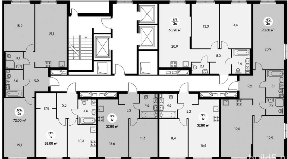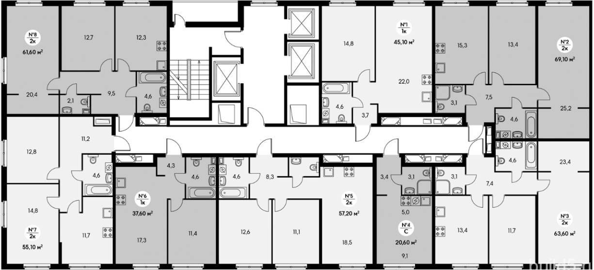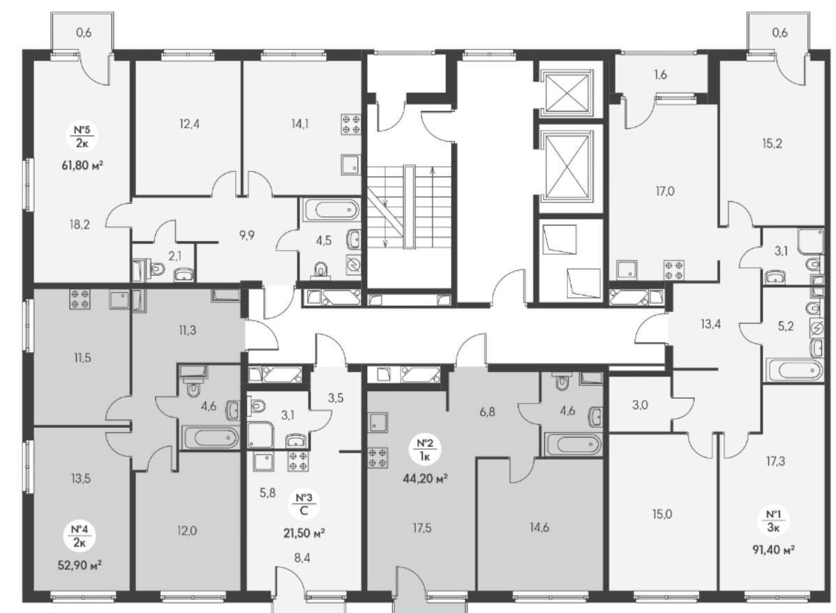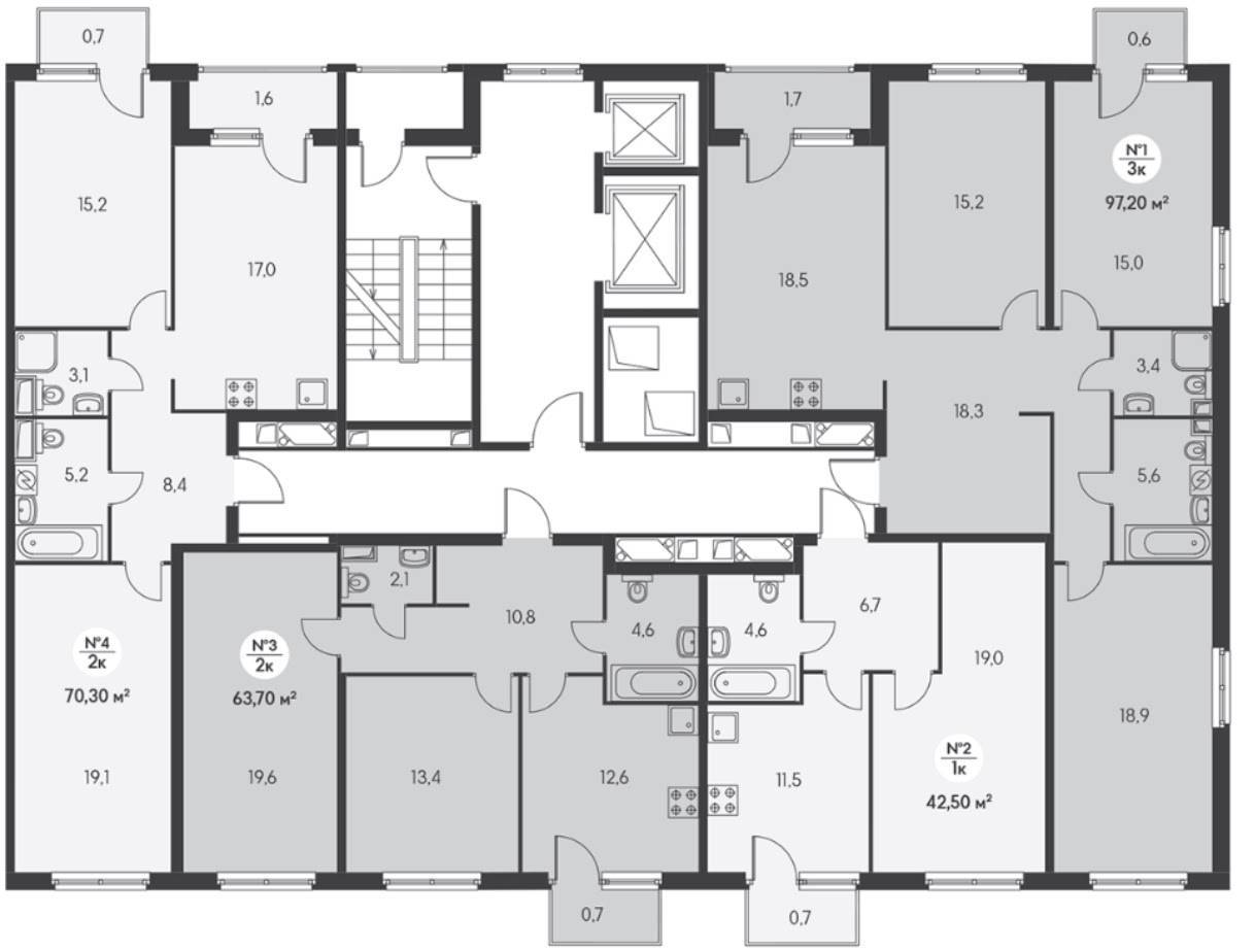 При изучении поэтажных планов можно обнаружить, что этажи не перенаселены. По 4 – 8 квартир на этаж — вполне приемлемо и даже хорошо для комфорт-класса.