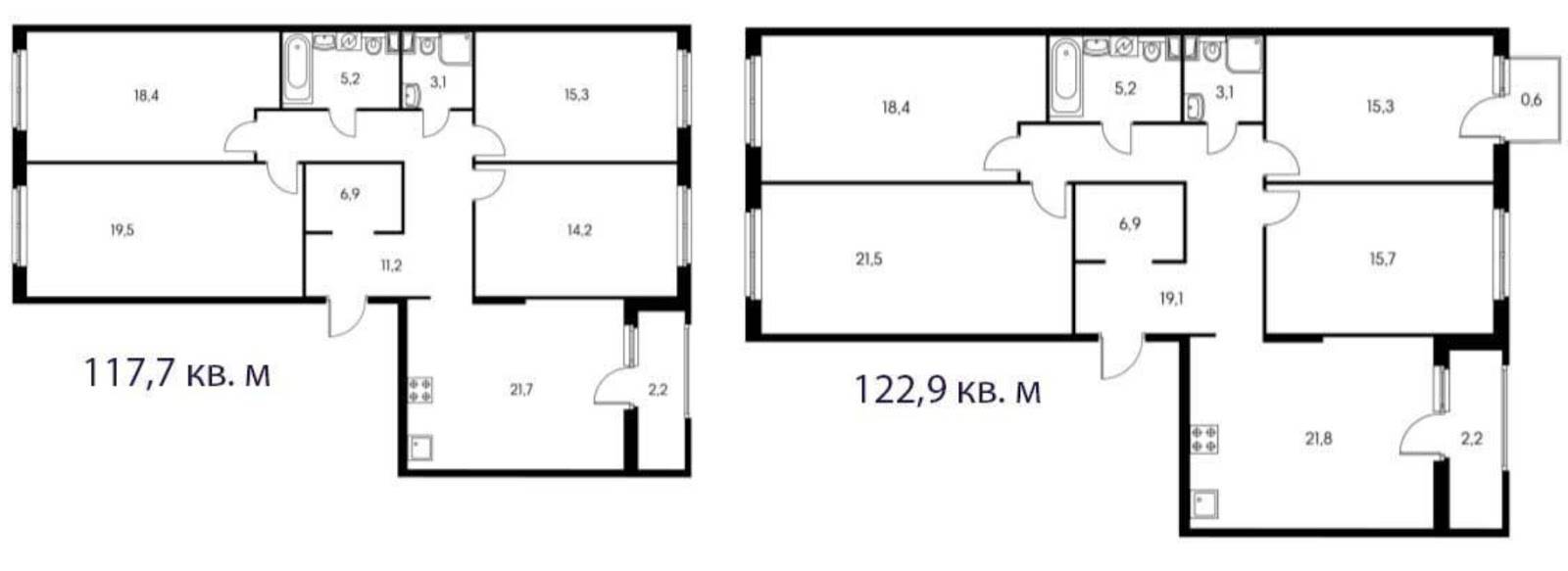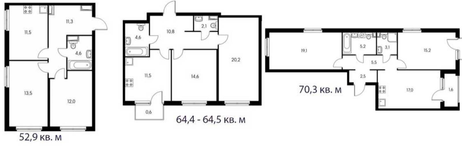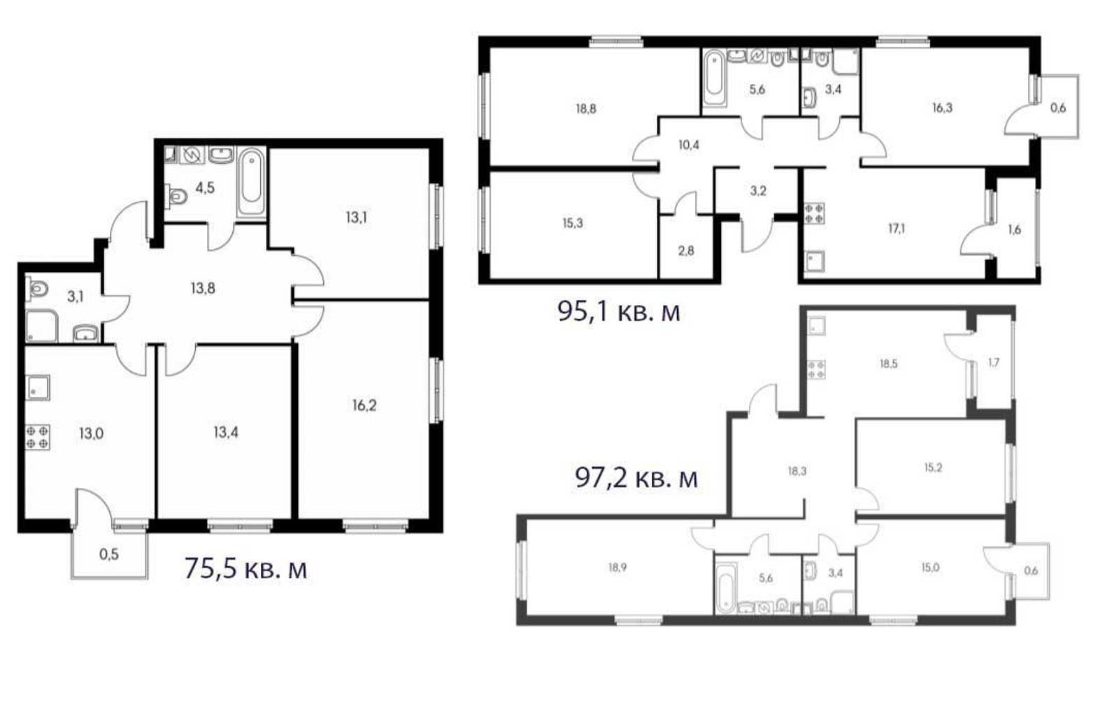 В трехкомнатных квартирах заметно прирастают кухни, везде есть гостевые санузлы с душевыми кабинами, а просторная планировка более 97 кв.м имеет интересное компоновочное решение с выделенным пространством в прихожей. Увеличенные прихожие в квартирах по 4 комнаты позволили заложить в планировки гардеробные комнаты не самого малого размера. Здесь просматриваются интересные просторные кухни с выходом на редкие для ПИКовских домов лоджии.