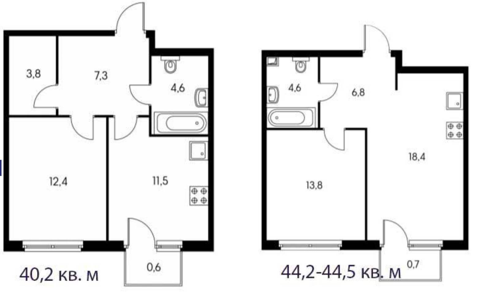 Однокомнатные квартиры от 40 до почти 45 кв.м привлекут внимание любителей и классической компоновки, и евроформата. В одном варианте можно получить сочетание из небольшой комнаты и небольшой кухни, в другом — увеличенную кухонно-гостиное пространство с пилоном вместо стены в прихожей.