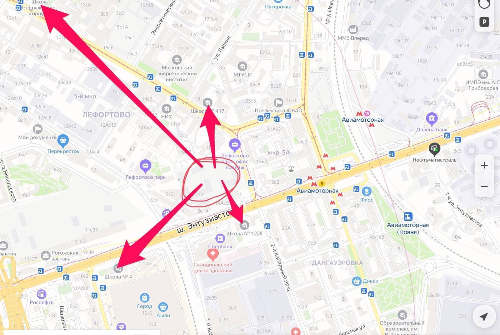 Несмотря на расположение на участке бывшей промзоны, новостройка оказалась в районе с достаточно развитой инфраструктурой. В шаговой доступности просматривается 3 школы и один детсад (примерно 800 м на юг), несколько медцентров, два крупных скопления торговых объектов, в том числе “Ашан” и группа магазинов у метро Авиамоторная. Относительно далеко только поликлиника. Отсутствие близкого детского сада должно компенсироваться ДДУ, уже открытым в комплексе. Но 200 мест в нем создано на коммерческой основе, не все готовы платить значительные суммы за услугу.
