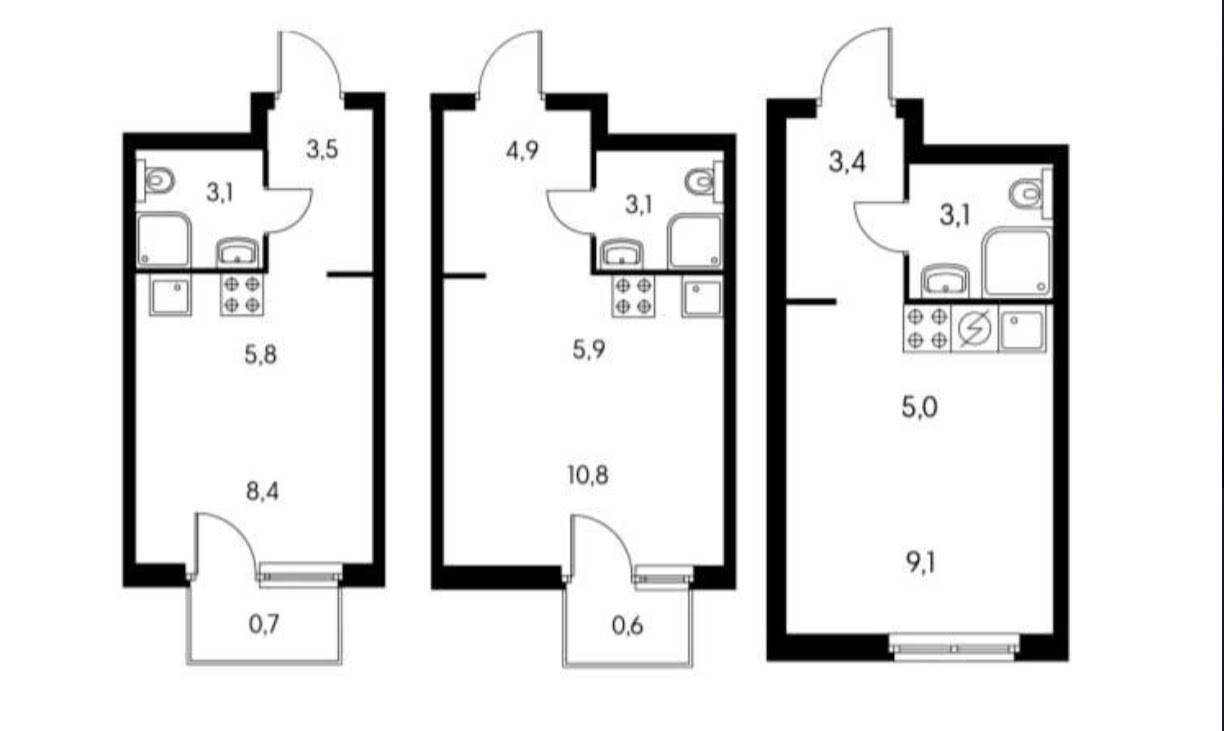 Студии реализованы как пеналы с окном в торце или выходом на французский балкон. Санузлы с душевыми кабинами.