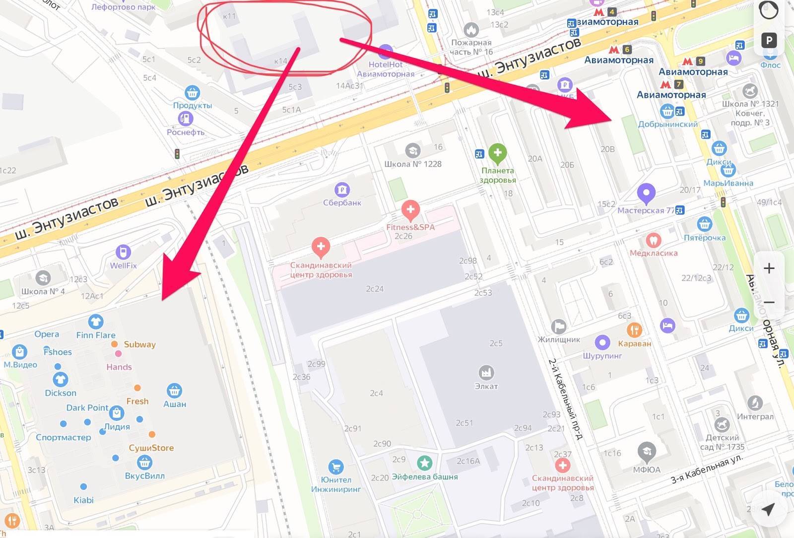 Недостатком окружения можно считать два фактора — расположение большинства объектов за шоссе Энтузиастов и отсутствие мест для прогулок. Вокруг либо жилая застройка, либо промзоны. Только примерно в километре на северо-запад начинается зеленый массив Лефортовского парка с прудами, к которому ведет Красноказарменная улица.