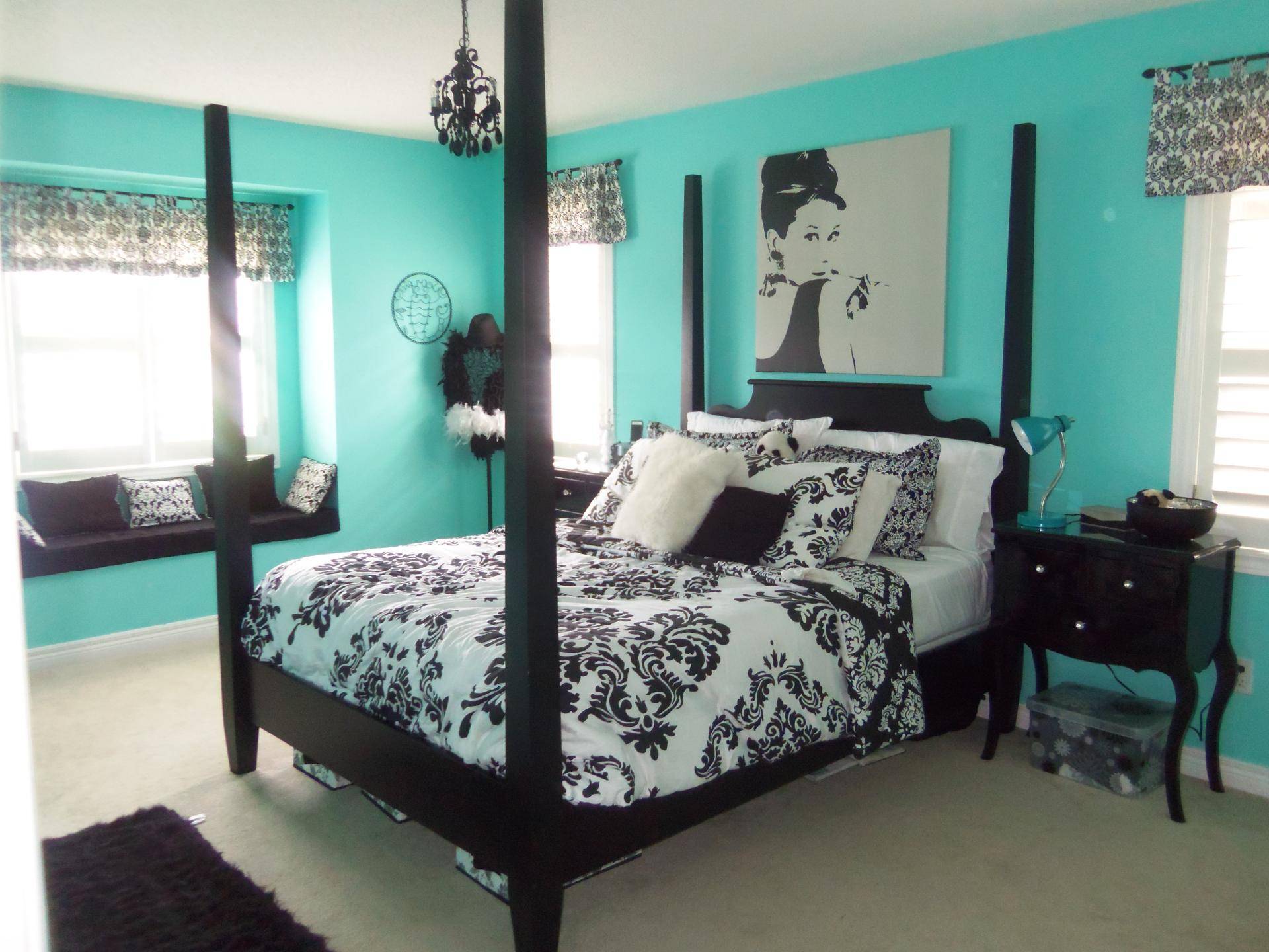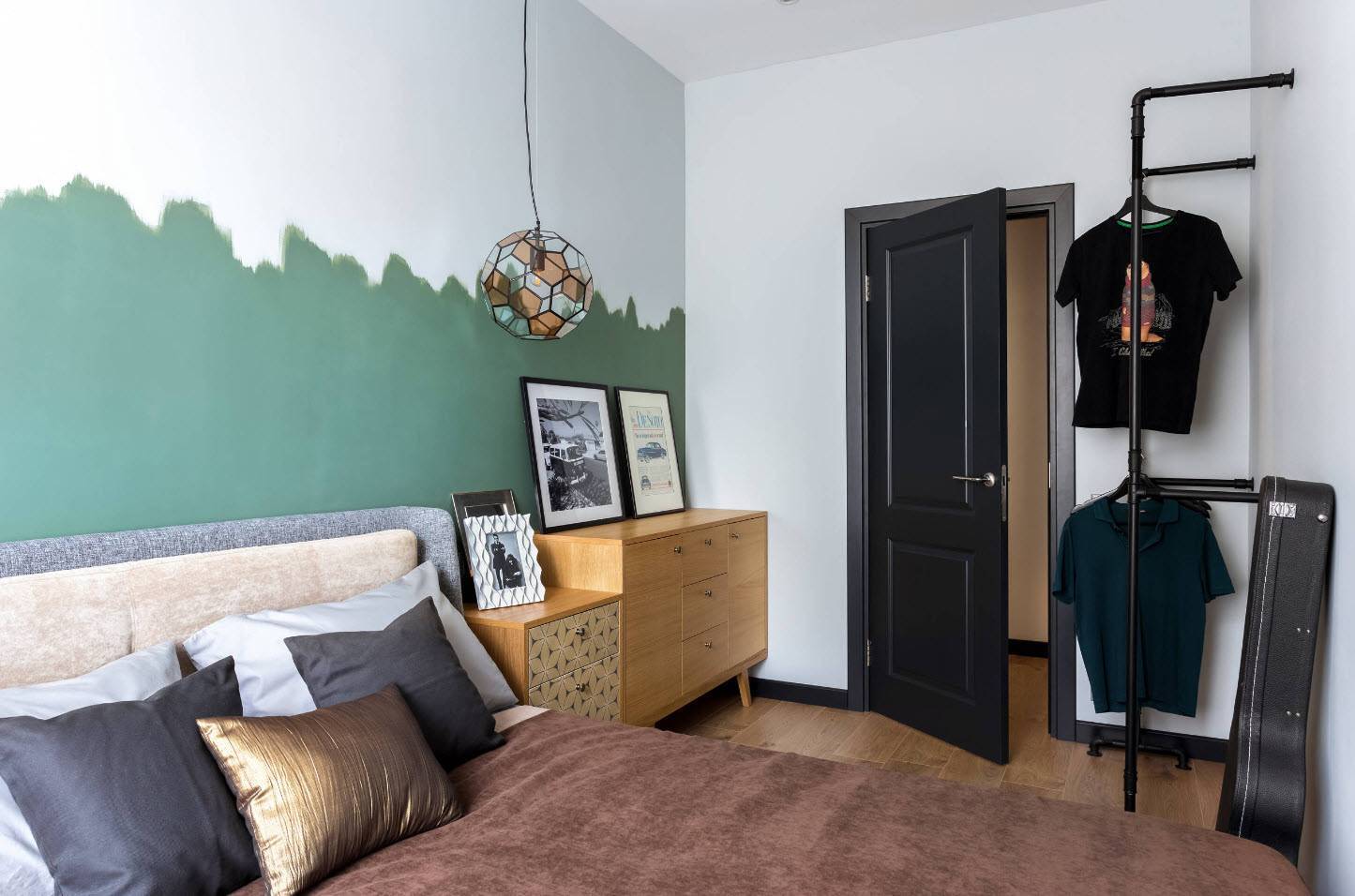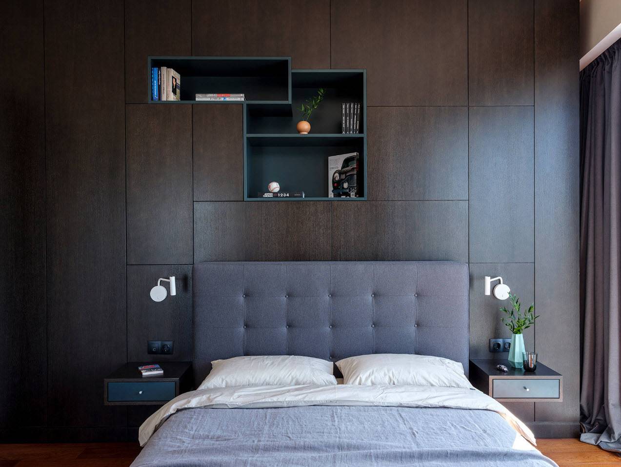 Черную либо темно-серую стену спальни дополняют красными, молочными или голубыми оттенками на других гранях комнаты.