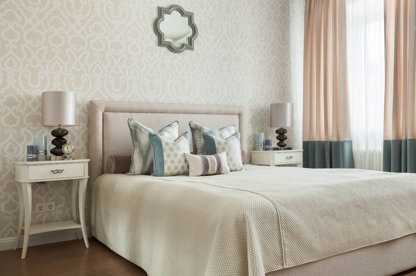 - Популярные и немного «заезженные» бежевые и молочные оттенки можно заменить бледно-голубыми либо нежно-розовыми цветами. Первый вариант удобней для комнат, выходящих окнами на юг, а второй — на север.