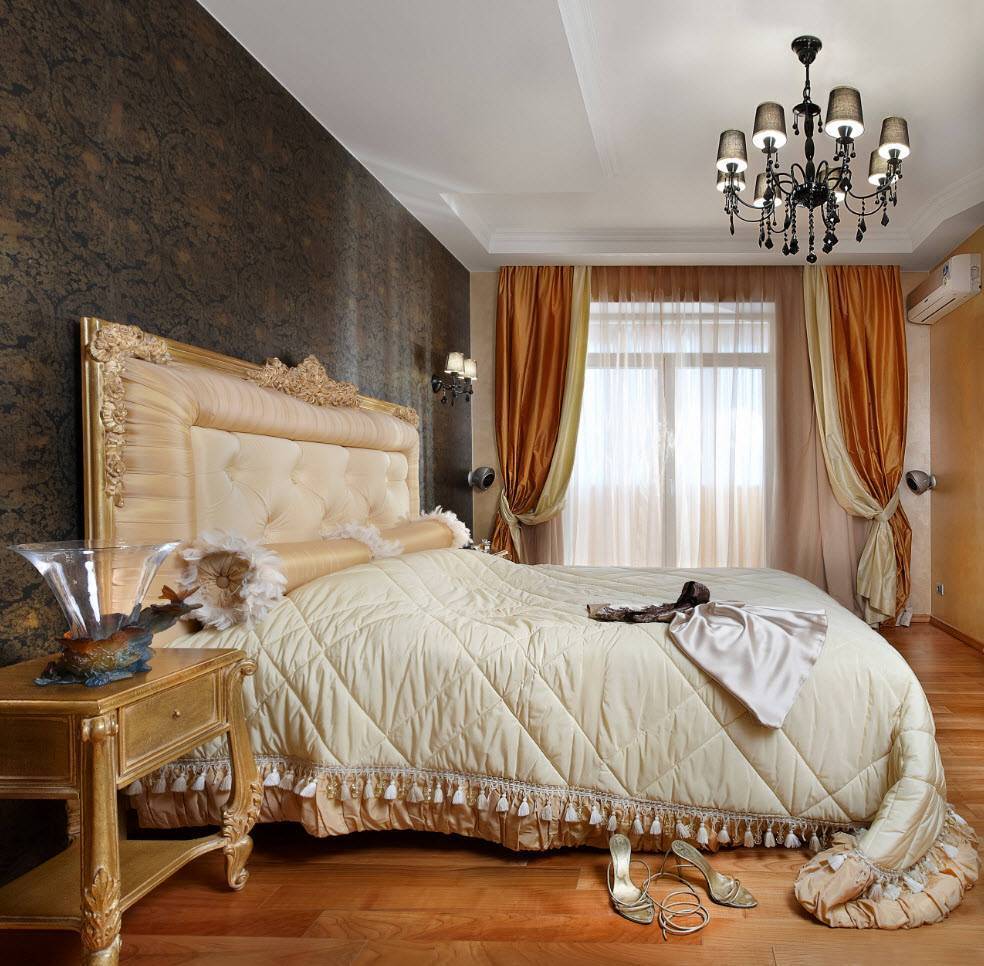 Правда, скорее всего, такое решение требует дополнения, например, нужно сделать специальные накладки на ножки кровати и прикроватные столики. Если лепнина присутствует только в изголовье кровати и более нигде, этот декор не прослеживается, он может смотреться как чужеродный элемент в интерьере.