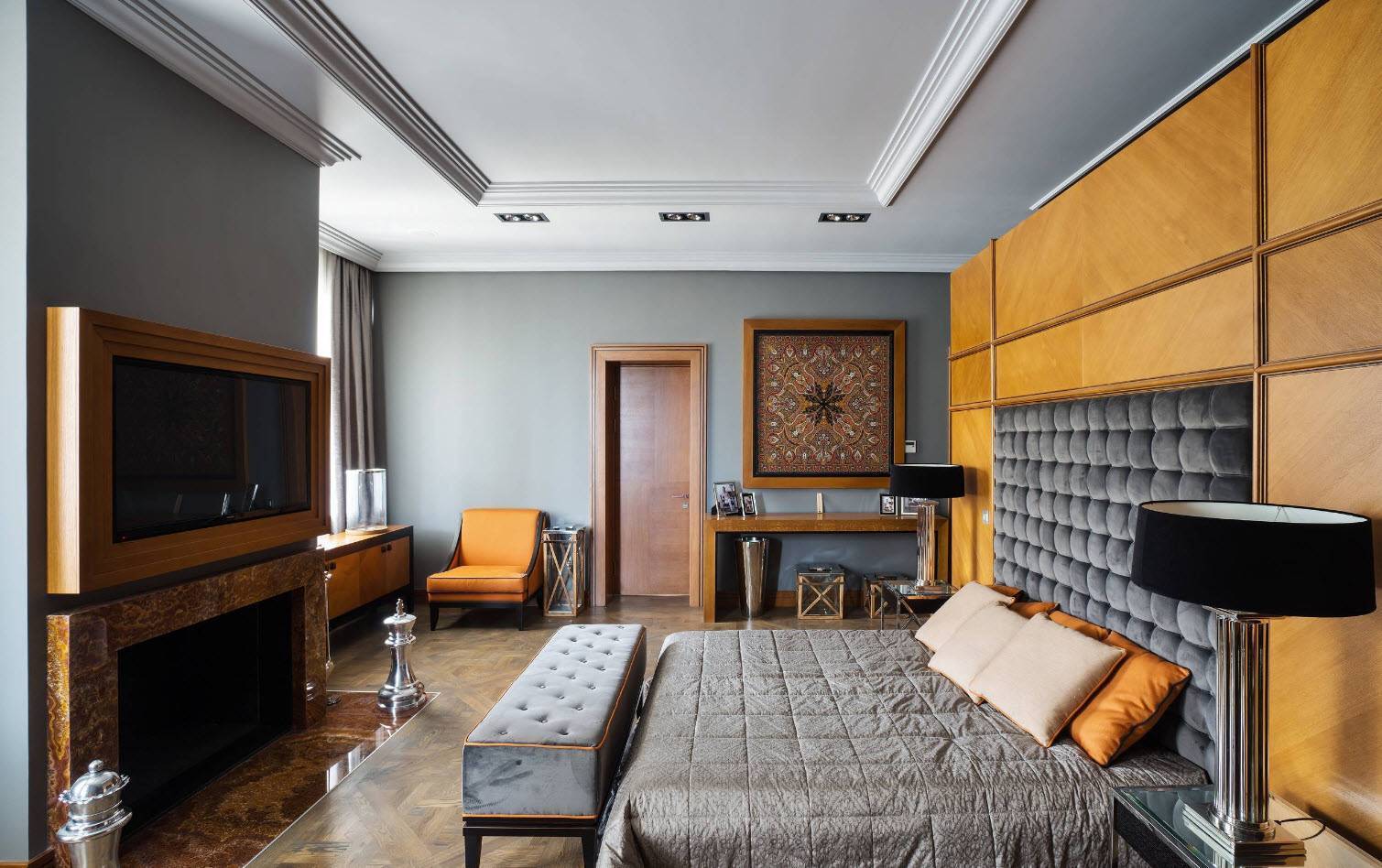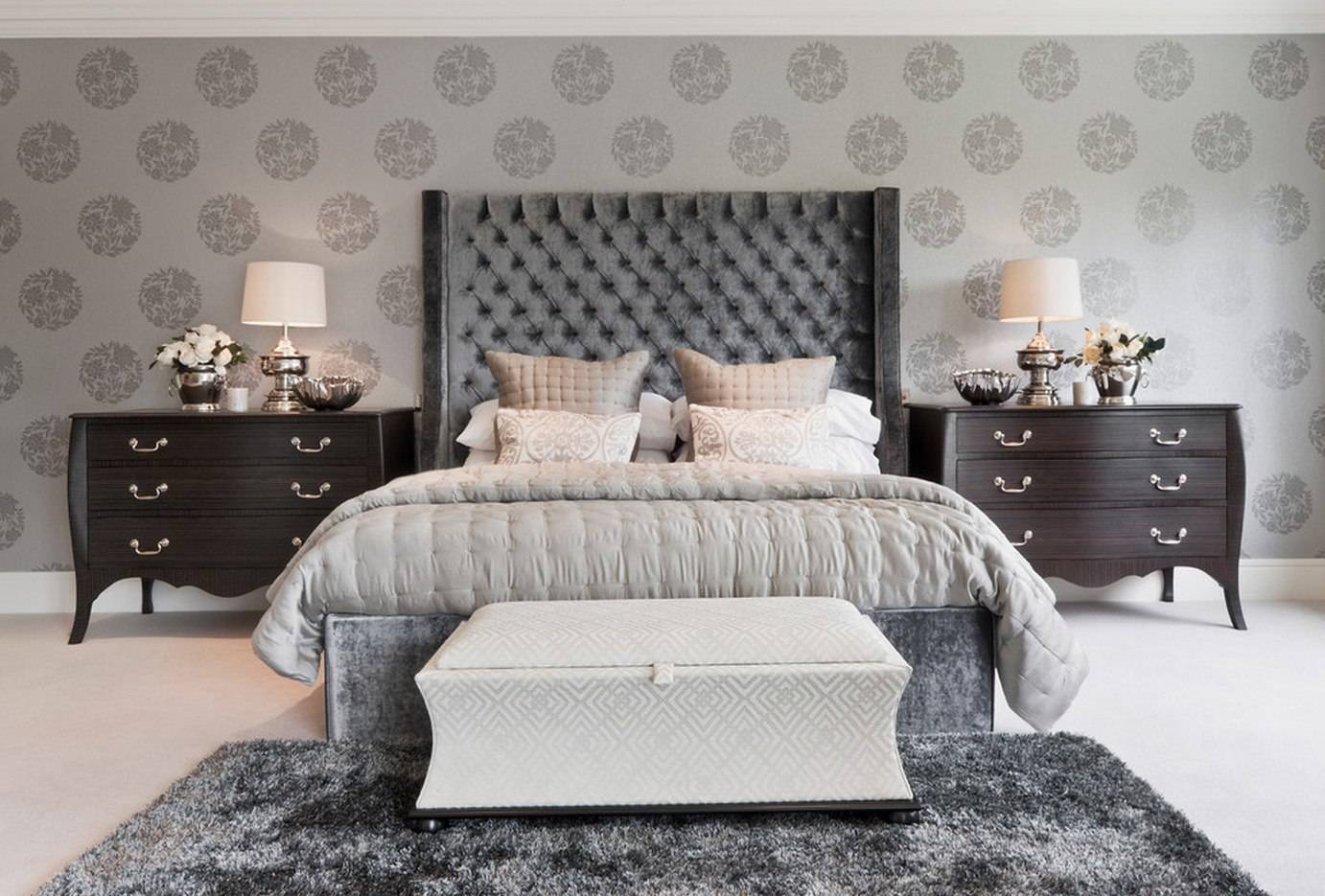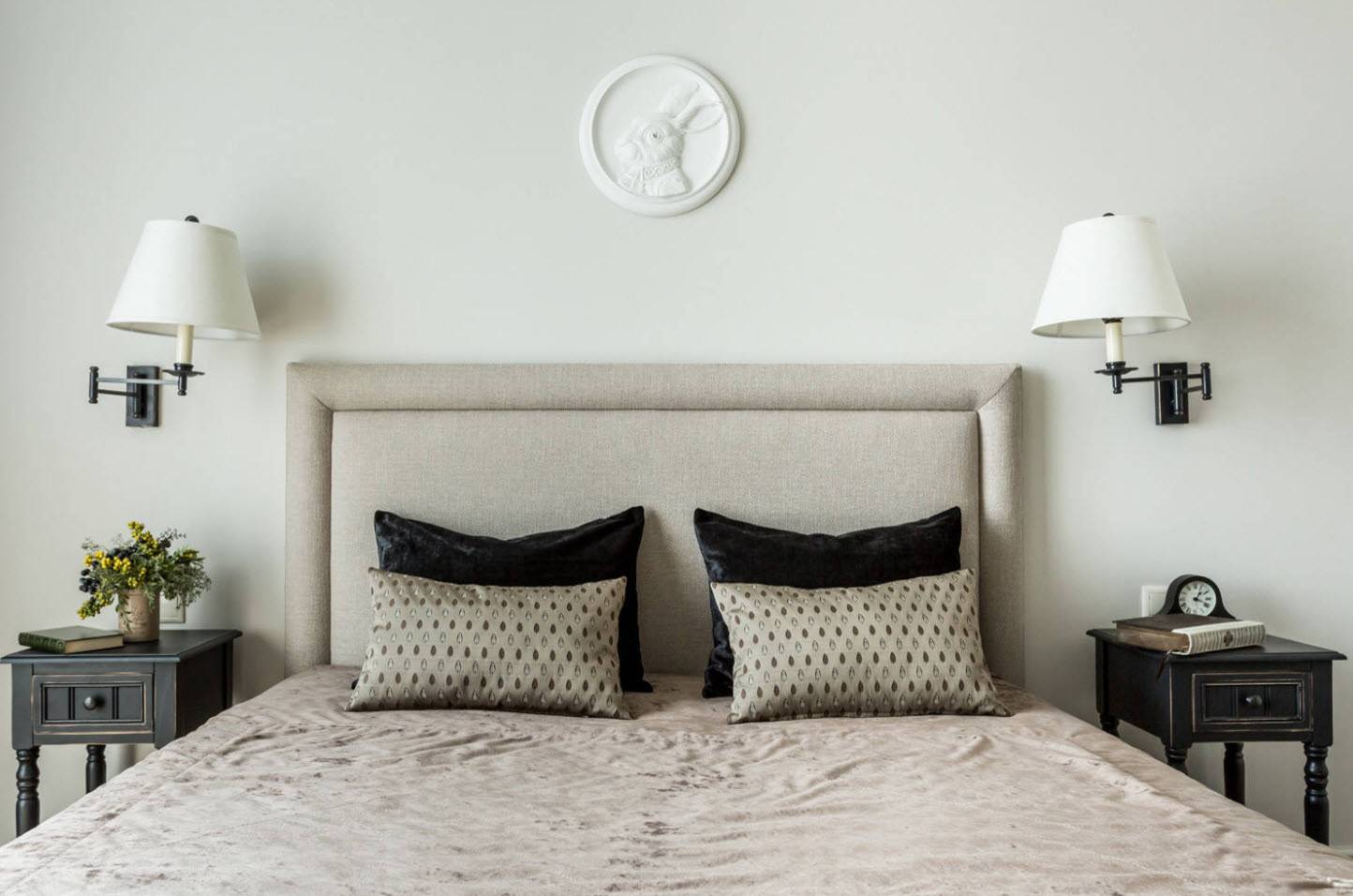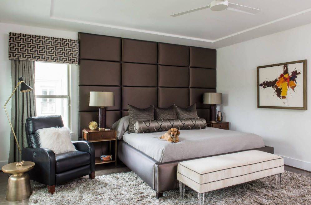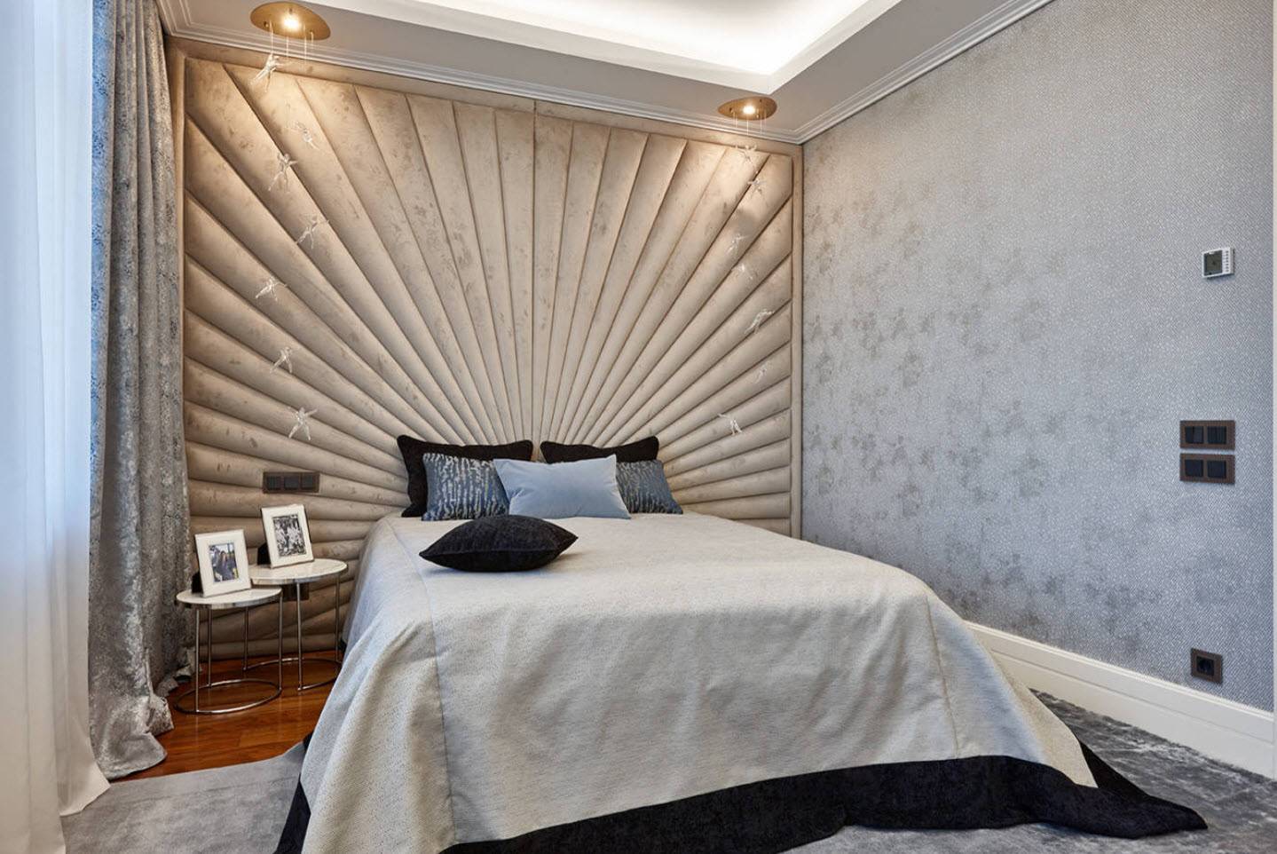 Задекорировать место у изголовья рекомендуется и с помощью мягких стеновых панелей или каретной перетяжки текстиля, драпировкой