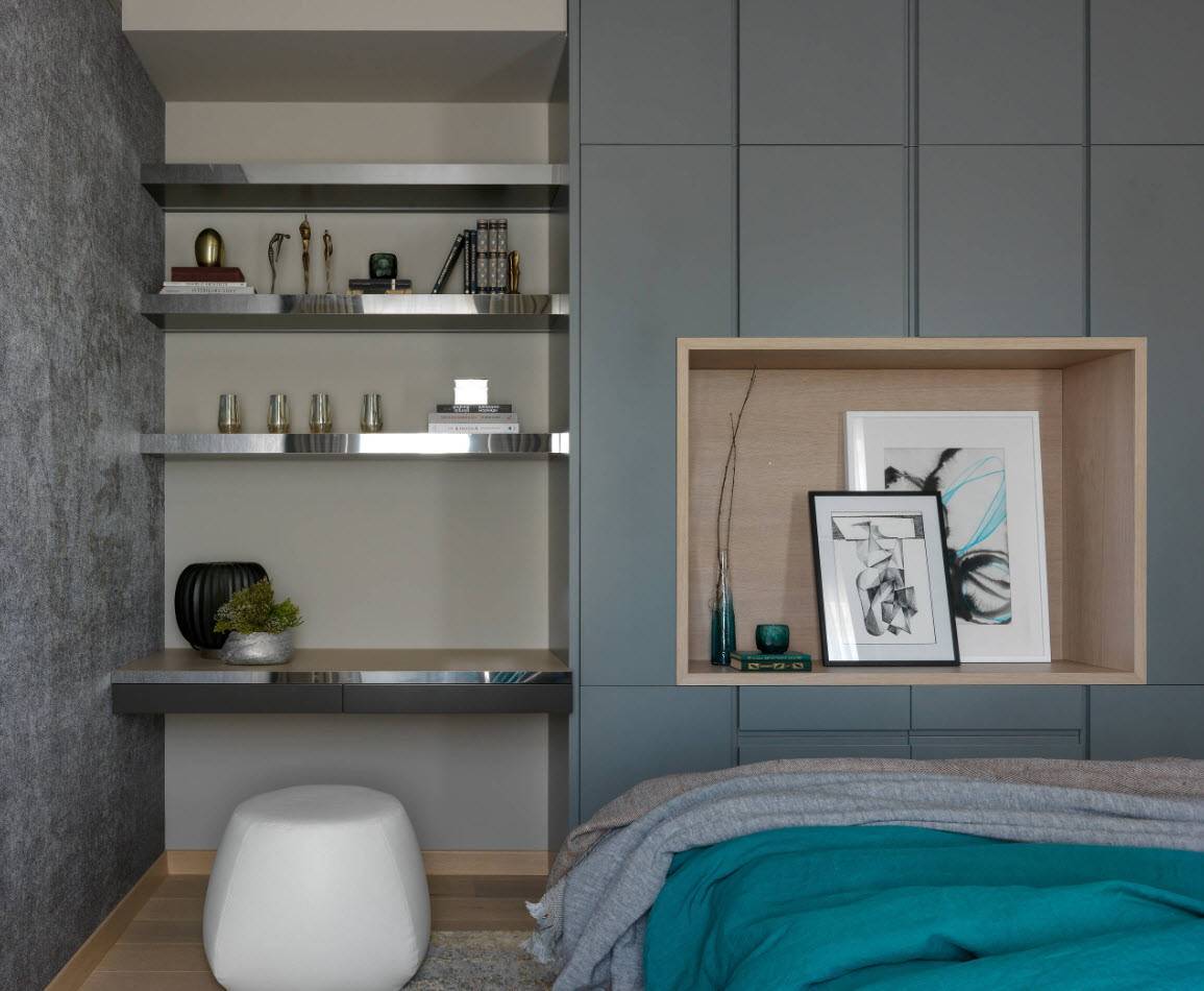 Особая выделенная ниша с зеркалами, дополнительным освещением станет прекрасной декорацией для спальни.