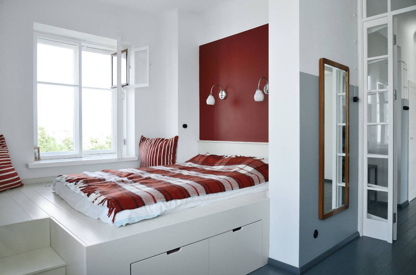 Особенно актуальны акцентные стены в условиях квартиры-студии, лишенной перегородок, разделяющих комнаты. Для выделения спальной зоны в подобных условиях нередко используют различные ширмы, передвижные перегородки, яркие акцентные стены. Как правило, такая поверхность остается пустой или украшается парой картин над изголовьем кровати (если располагается за спальным местом).