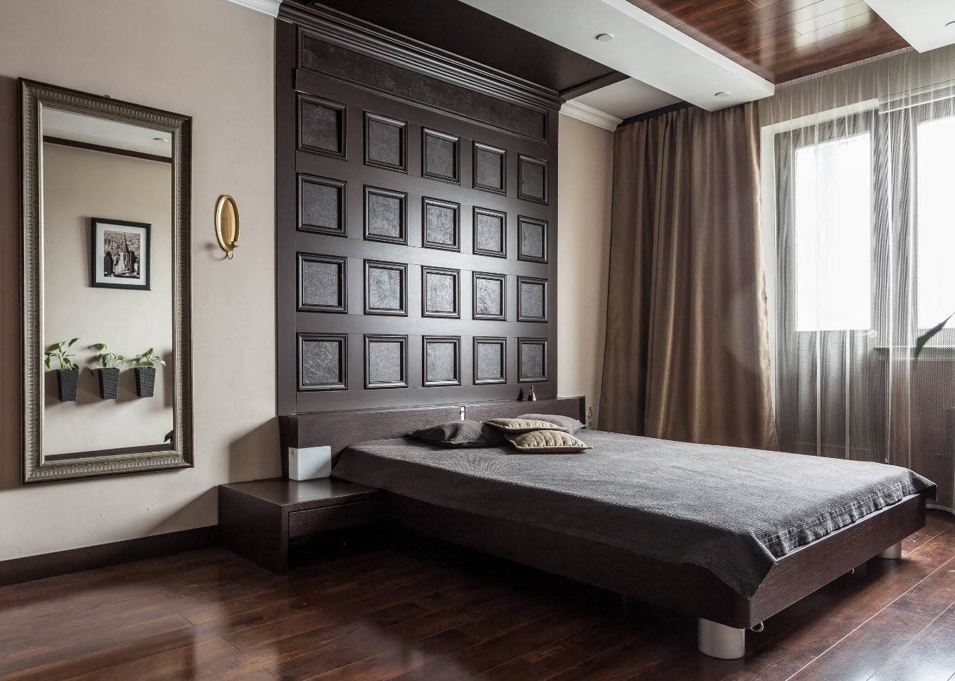 Нередко для отделки акцентной стены выбираются природные материалы. Это могут быть панели из ценных пород дерева разных оттенков. Подобные детали в интерьере спальной комнаты смотрятся «дорого» и оригинально. Однако стоит учитывать, что большинство деревянных панелей требует регулярного ухода. Их необходимо обрабатывать специальными веществами и пропитками, защищающими натуральный материал от высыхания, выцветания, растрескивания и размножения вредных микроорганизмов.