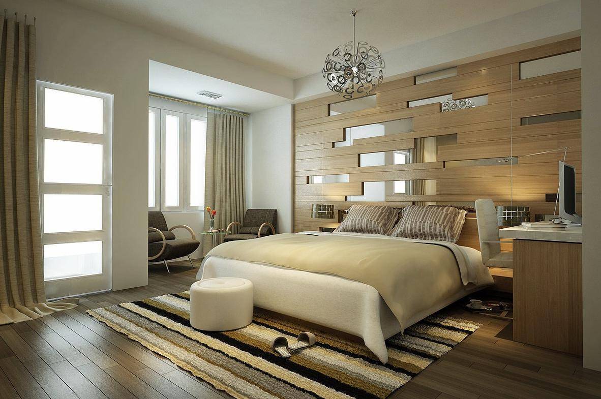 Популярностью пользуется отделка изголовья кровати белым кирпичом, деревянными панелями, ламинатом, каретной стяжкой.
