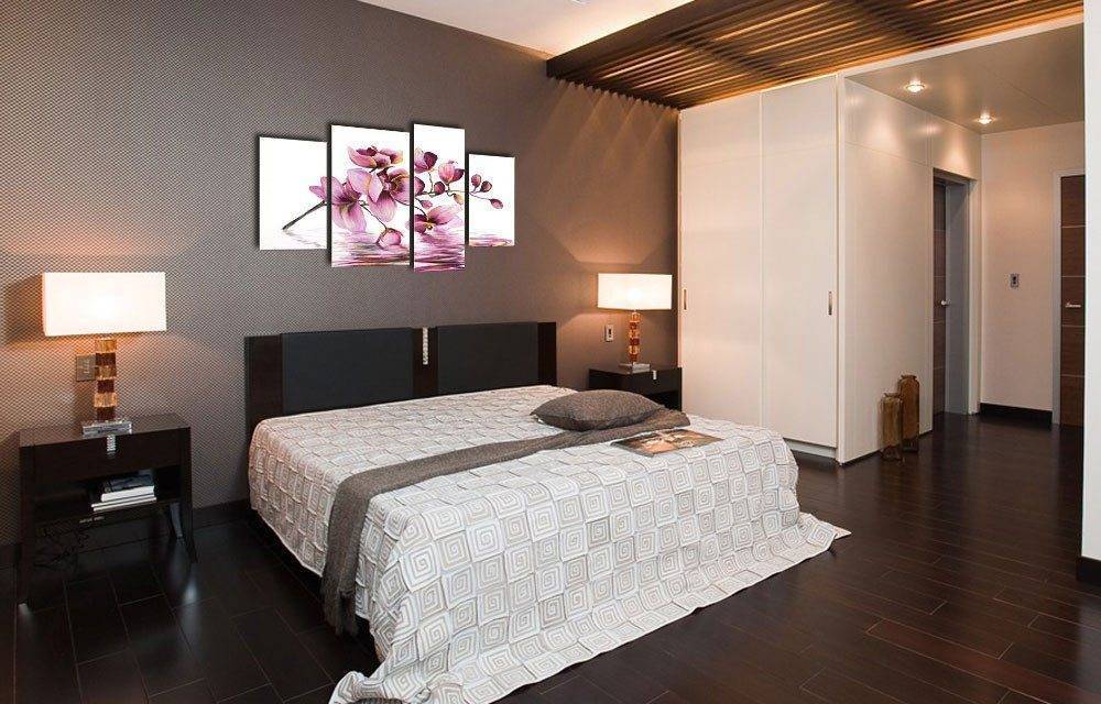 Самым распространённым вариантом декора выступают картины в спальню над кроватью. Это может быть один крупный холст или несколько экземпляров меньшего размера, расположенных в хаотичном порядке или придерживаясь определённого принципа.