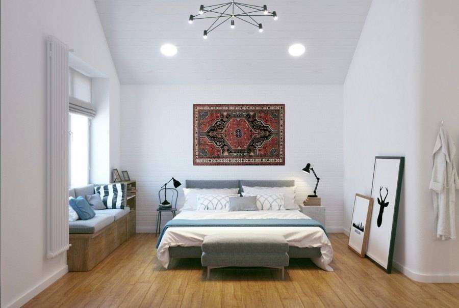 При обустройстве нужно учитывать высоту потолка, потому что в низких помещениях не рекомендуется устанавливать навесное оборудование. Зрительно это ещё больше уменьшит спальню. Возможно сделать натяжной одноуровневый потолок, при этом высота стен не должна быть меньше 280 см. Во всех других случаях лучше просто выровнять поверхность, а после побелить или покрасить в светлый цвет в соответствии со стилем.