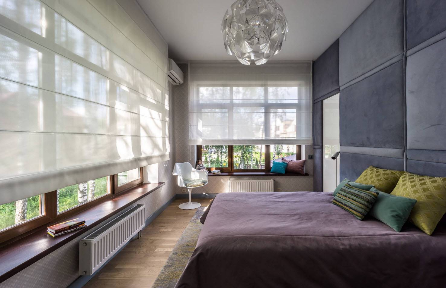 Нередко окна в спальной комнате располагаются на площади смежных стен. Их стоит оформлять воздушными занавесками, ненавязчивыми жалюзи, а также модными рулонными или японскими шторами.