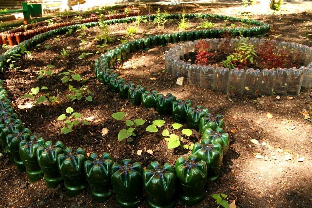 Оставшиеся после застолий пластиковые бутылки, также могут пригодиться декоратору цветочных клумб. Вставленные по типу стеклянных бутылок, заботливо раскрашенные в разные цвета, озарят зеленое пространство яркими нотами.