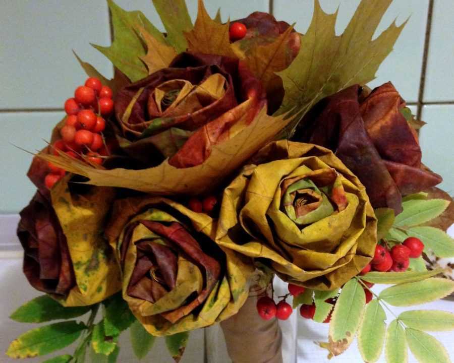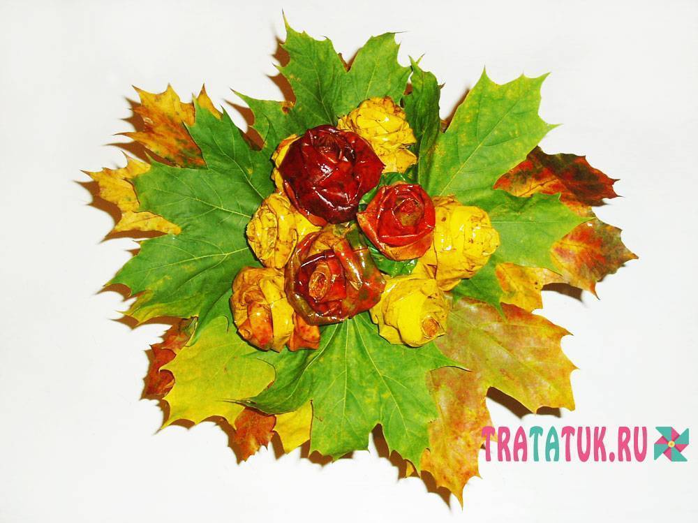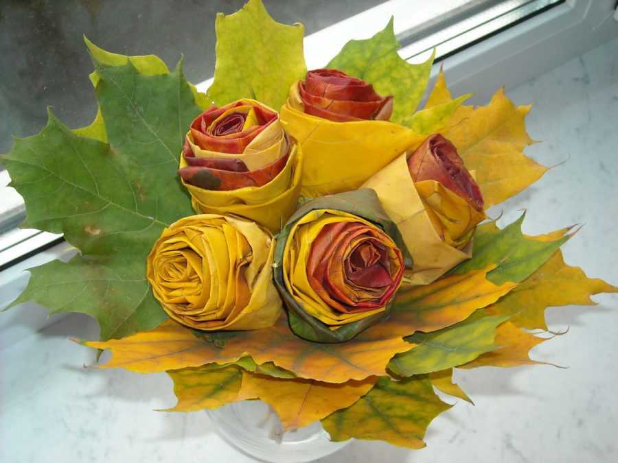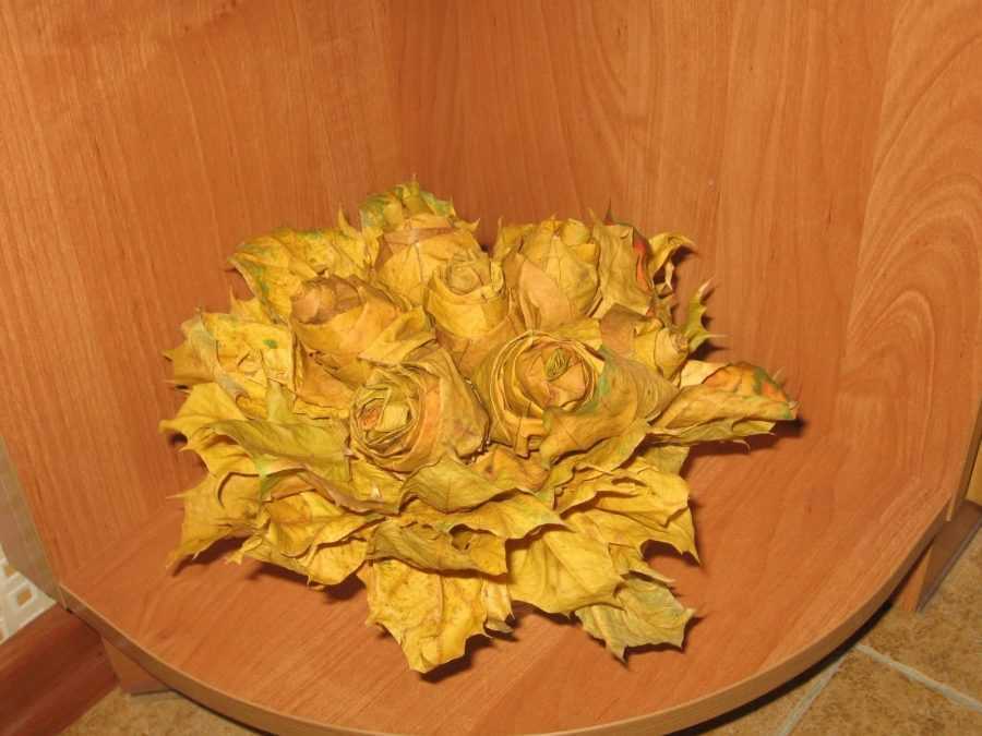 С большей долей вероятности, эту поделку уникальной не назовешь, на любой выставке, практически в каждых группе или классе кто-нибудь да и сделает эти шикарные лиственные розочки. И это абсолютно не страшно, потому как у всех они все равно красивые, могут разниться объемом и цветом.