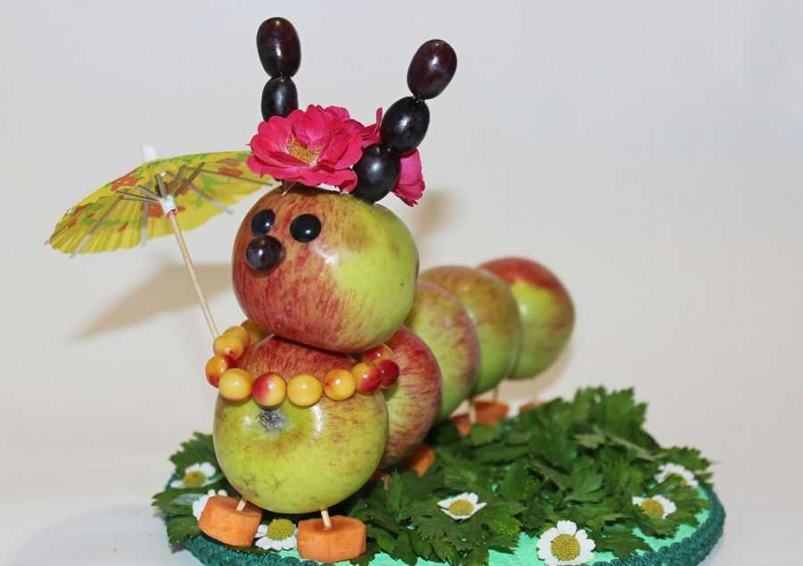 Несмотря на то, что задумка не новая, шикарная и яркая гусеничка – всегда производит фурор на выставках, может стать настоящим украшением класса, группы. Но главным ее достоинством является то, что сделать ее очень легко. Используются различные яблоки, морковка, виноградинка, и по желанию, листья и ягоды для украшения.