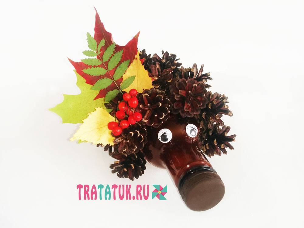 В этой работе также нужна помощь взрослых, так как бутылка – не лучший материал, к которому крепятся шишки. Нужна некоторая сноровка и клеевой пистолет. Но в основном – ничего сложного, шишками плотно оклеивается одна из сторон бутылки, а затем формируется образ ежика.
