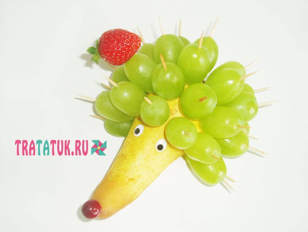 Такой ежик может быть не только в качестве осенней поделки, но и оригинальной подачей фруктов и ягод на праздничный стол. Работа очень легкая, деткам понравится утыкать зубочистками с виноградом грушу, формируя яркий и оригинальный облик ежа. А заодно в процессе полакомиться вкусными ягодками.
