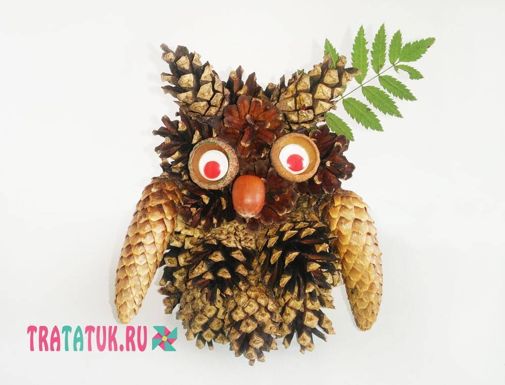 В сравнении с представленной выше подборкой осенних поделок из природных материалов, сову сделать не так просто. Может потребоваться помощь взрослых, чтобы основательно приклеить шишки к основе из папье-маше клеевым пистолетом. С другой стороны, совместная работа- это весело, интересно и объединяюще.