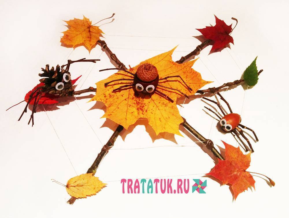 Еще одна отличная осенняя поделка из природного материала. В работе используются ветки или сучья, листья, нитки и пластилин. Ну а жителя паутины можно сделать из шишки, каштана, желудя. Сама работа легкая, но может потребоваться помощь взрослых, чтобы хорошенько накрутить нитки.