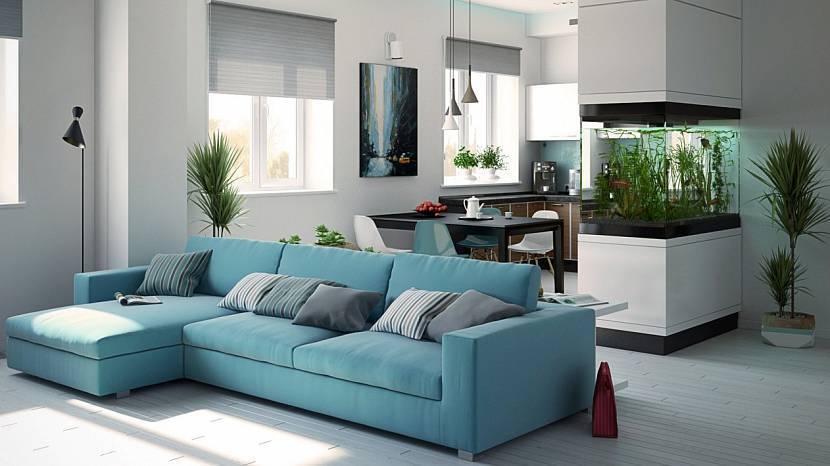гостиной, совмещенной с кухней, является аквариум с неяркой подсветкой.