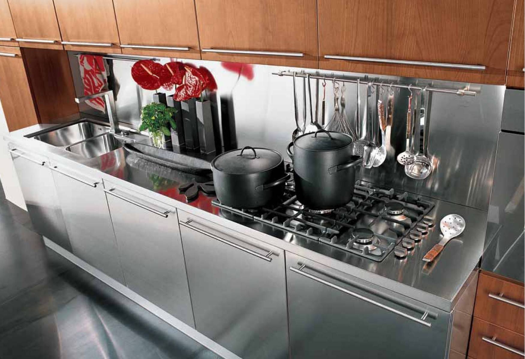 Однако, на поверхности рабочей стены на кухне всегда будут видны брызги воды, а на кухни без них никуда. Если вы фанат чистоты и порядка на кухне, то это будет постоянно раздражать. Более того, металл можно отнести в категорию холодной облицовки. Такие стены и визуально холодные и тактильно. Учитывая это, стоит продумать свой интерьер буквально до каждой мелочи.