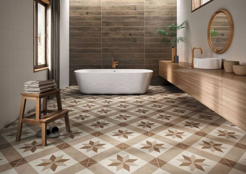 Тенденция натуральности и естественности по-прежнему существует. Например, кафель под старину или дерево будет идеальным вариантом для оформления ванной в современном стиле. Дизайнеры рекомендуют для стен использовать удлиненные модели кафеля. Особый интерес вызывают экземпляры с вырисованными сучьями.