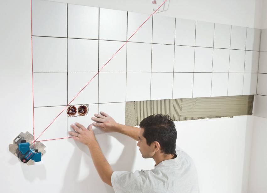 Начинать укладывать плитку можно от уровня пола или от края ванны. Но обязательно с середины стены. Если вы решили клеить по уровню ванной, то по всему периметру комнаты вровень с краем ванной необходимо разместить рейку, на которую будет опираться первый ряд плитки. Опору после высыхания клея нужно убрать. В случае, если поклейка начинается сверху, рейка должна находиться снизу, за краем резанного кафеля. Этот уровень измеряется следующим образом: с верхнего уровня поклейки отсчитывается, сколько рядов целой плитки поместится до пола, а ниже будут обрезки. Для опоры верхней плитки и нужна рейка. Поклейка плитки начинается от неё и идёт вверх. После высыхания клея, рейка опять-таки убирается, и снизу доклеиваются обрезанные части.