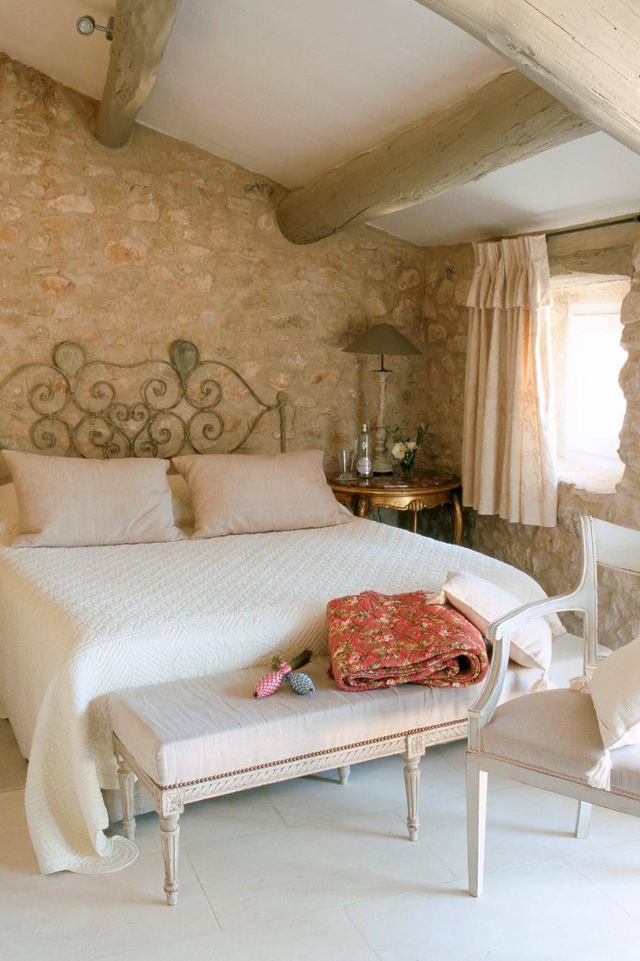 Для акцентирования внимания на конкретной зоне спальни одну из стен иногда выделяют отделкой другого типа. Например, оштукатуривают и белят, или отделывают декоративной штукатуркой. Добиваться идеальной поверхности не обязательно, легкая небрежность отделки лучше соответствует духу стиля.