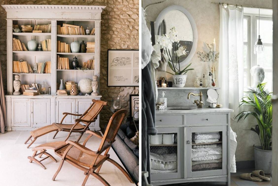 Мебель обычно деревянная, состоящая из натурального материала или побелена, иногда окрашена в пастель, теплые цвета. Дополнения, которые обычно встречаются, сделаны из: