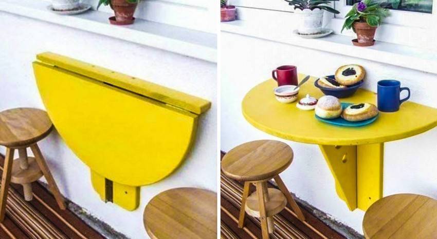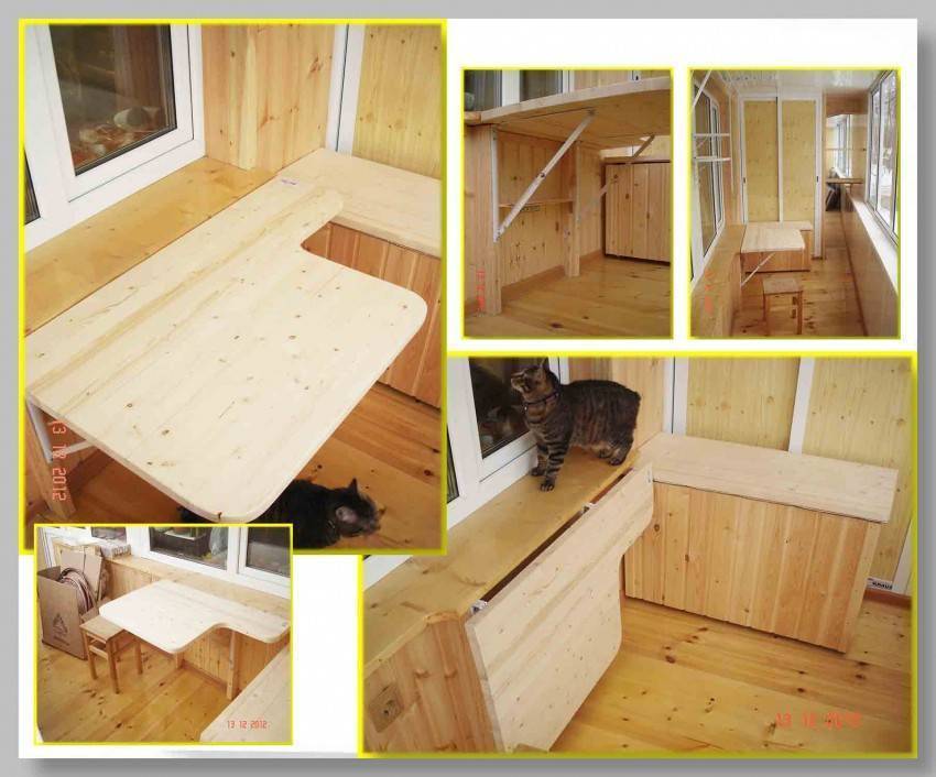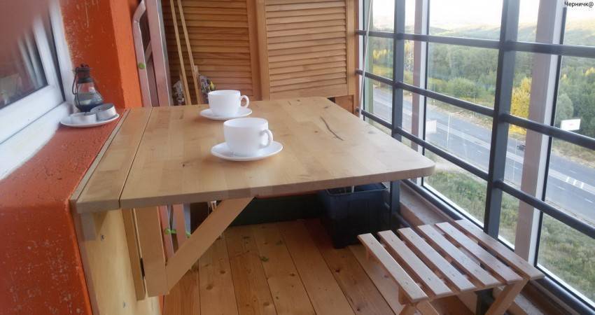 Менее распространенный вариант – откидной стол со стационарной тумбой. Его конструкция позволяет выделить на балконе место для хранения вещей. Когда столешница, прикрепленная к стене петлями, поднимается, тумба превращается в сиденье. Но даже в сложенном виде мебель занимает на лоджии большую площадь.