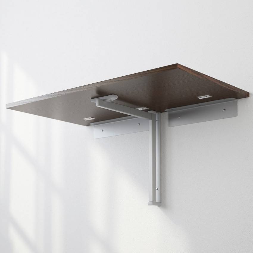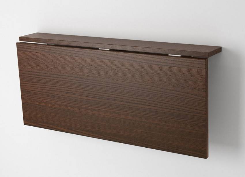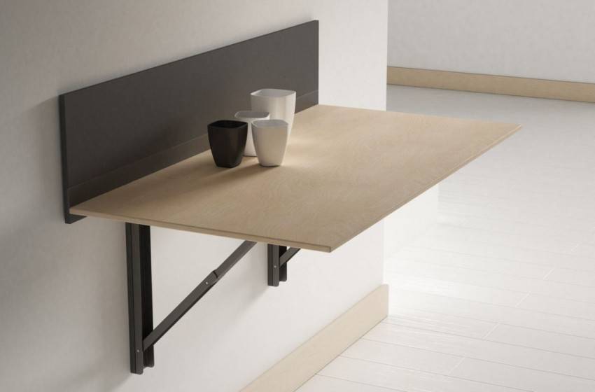 Откидной столик с креплением к стене — столешница, зафиксированная специальным треугольным либо прямоугольным крепежом. В закрытом состоянии эта конструкция выглядит как небольшая планка. В разложенном — представляет собой обычный обеденный стол, идущий от стены.
