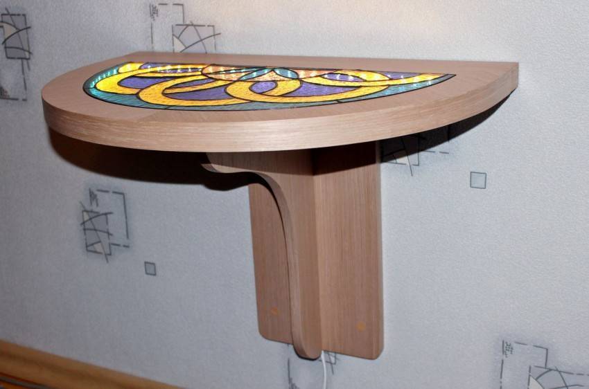 На выбор материала влияет место, где будет установлен встроенный столик. Изготовленный из дерева или стекла, он будет смотреться при установке его отдельно от других предметов мебели.Универсальным материалом считаются МДФ, ДСП и фанера.
