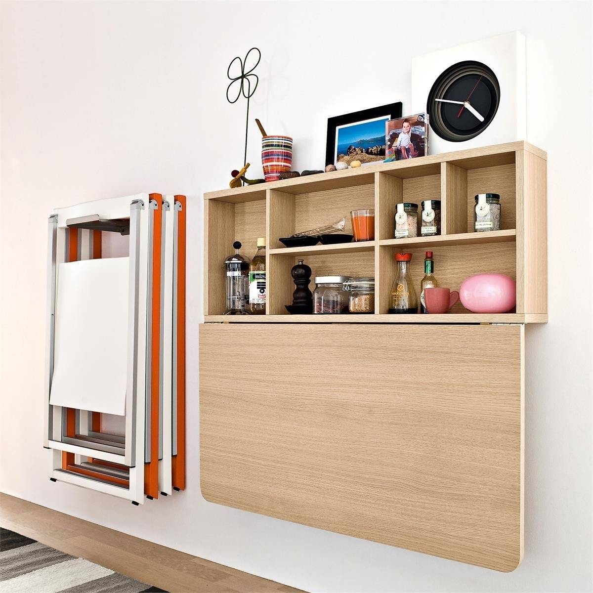 Откидной столик с креплением к стене — столешница, зафиксированная специальным треугольным либо прямоугольным крепежом. В закрытом состоянии эта конструкция выглядит как небольшая планка. В разложенном — представляет собой обычный обеденный стол, идущий от стены.