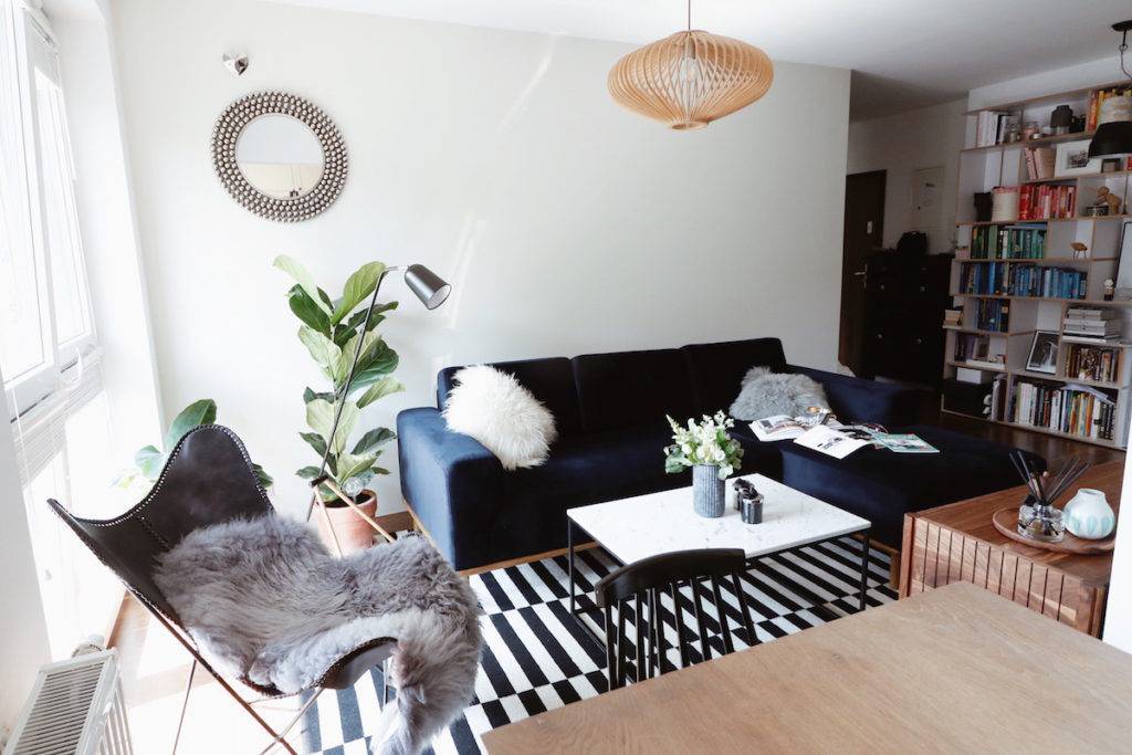 Гостиная всегда больше, чем спальня, что также дает вам больше возможностей для творчества. В исключительно просторном интерьере вы можете использовать только темные цвета. В последнее время темно-синий приобрел популярность. Этот глубокий оттенок в сочетании с лепниной позволит вам создать элегантную композицию.
