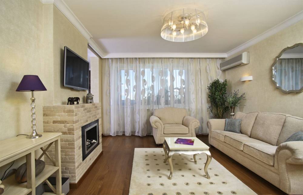 Декоративная штукатурка в зале позволяет сгладить все неровности, к тому же выглядит она эффектно. Добавить изыска могут узоры, которые создаются шпателем.
