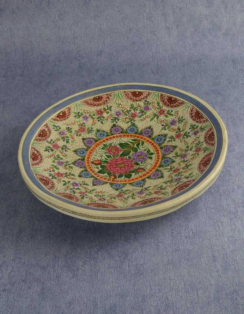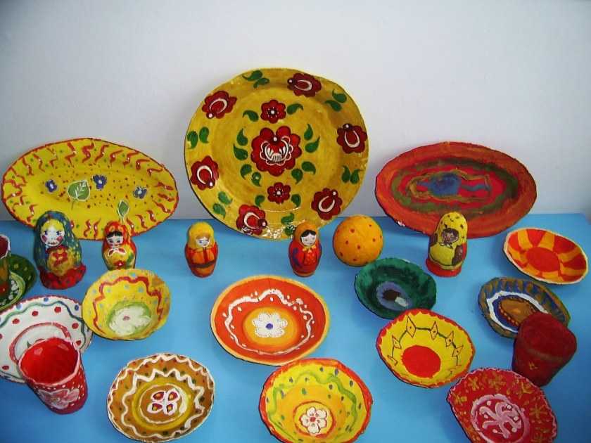 Не более сложным является создание декоративной тарелки. Процесс ее создания потребует, помимо тарелки-образца и пищевой пленки, газет, клея ПВА, мисочки с водой и кисточки. Для декорирования работы также потребуются гуашь и лак для ногтей. Газета разрывается на небольшие кусочки со сторонами, равными 2 сантиметрам. Заготовленная посуда оборачивается пищевой пленкой и переворачивается вверх дном.