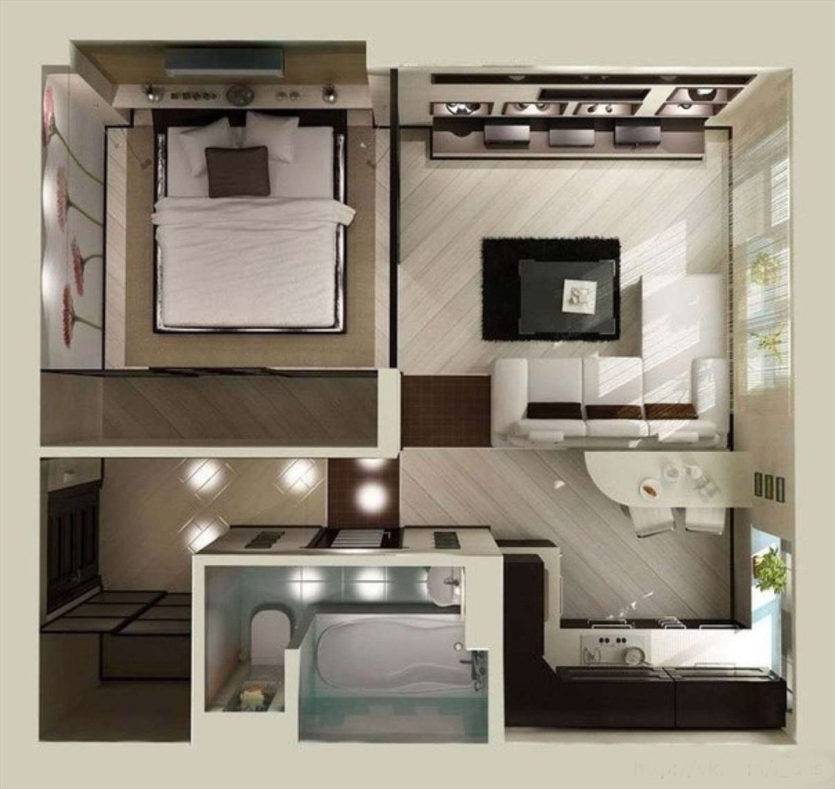 В квартирах-студиях больше пространственного маневра, чем в других вариантах облагороженных «хрущевок». Здесь схема расстановки ограничена лишь фантазией (в разумных пределах) хозяина квартиры. Другие же варианты заставляют вести отчаянную борьбу за лишние метры и безжалостно избавляться от полузаполненных объемных шкафов, антресолей и комодов. Освободив от лишней мебели стены комнаты, можно покрыть их зеркалами для визуального увеличения объема пространства.