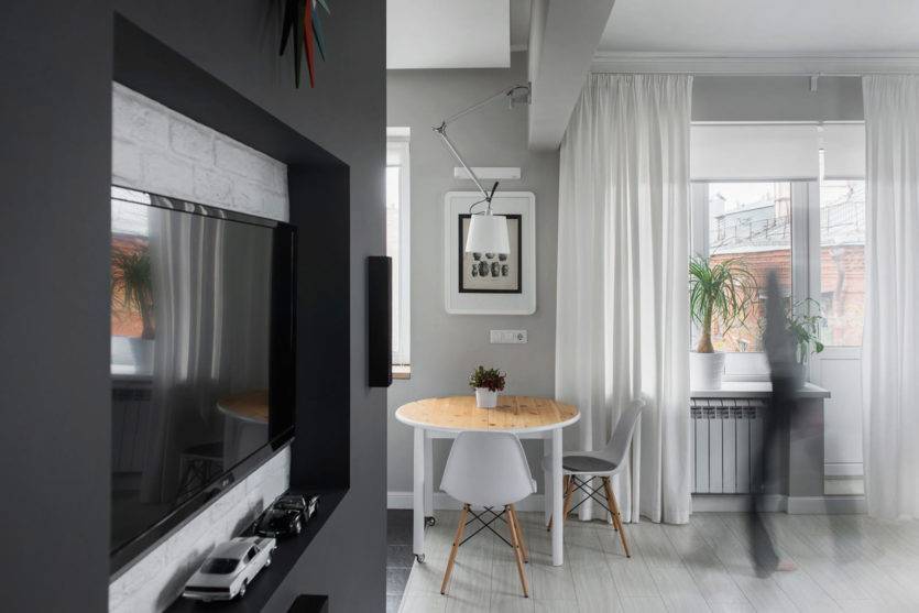 Благодаря четкому разделению на зоны и отсутствию лишних деталей жилое пространство используется максимально эффективно. На месте крошечной четырехметровой кухни разместилась очень светлая и компактная кухонная зона, которая, тем не менее, вмещает все необходимое. Для экономии пространства подоконник сделан продолжением кухонной столешницы. А вот небольшой обеденный столик сюда не помещался при всем желании и поэтому занял место на полпути в гостиную.