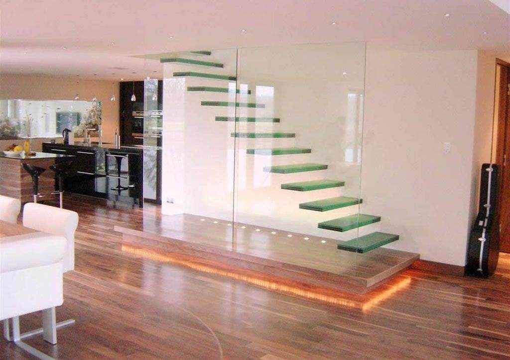 Стеклянные перила на лестницах можно встретить как в современных домах, так и в торговых и бизнес-центрах. Стеклянные перила и лестницы придают помещению определенный стиль, они не препятствуют проникновению света, и в случае, если лестница расположена в центре помещения, не будет происходить затенения пространства за ней. Стеклянные перила с подсветкой в темное время придадут лестнице эффектный вид.