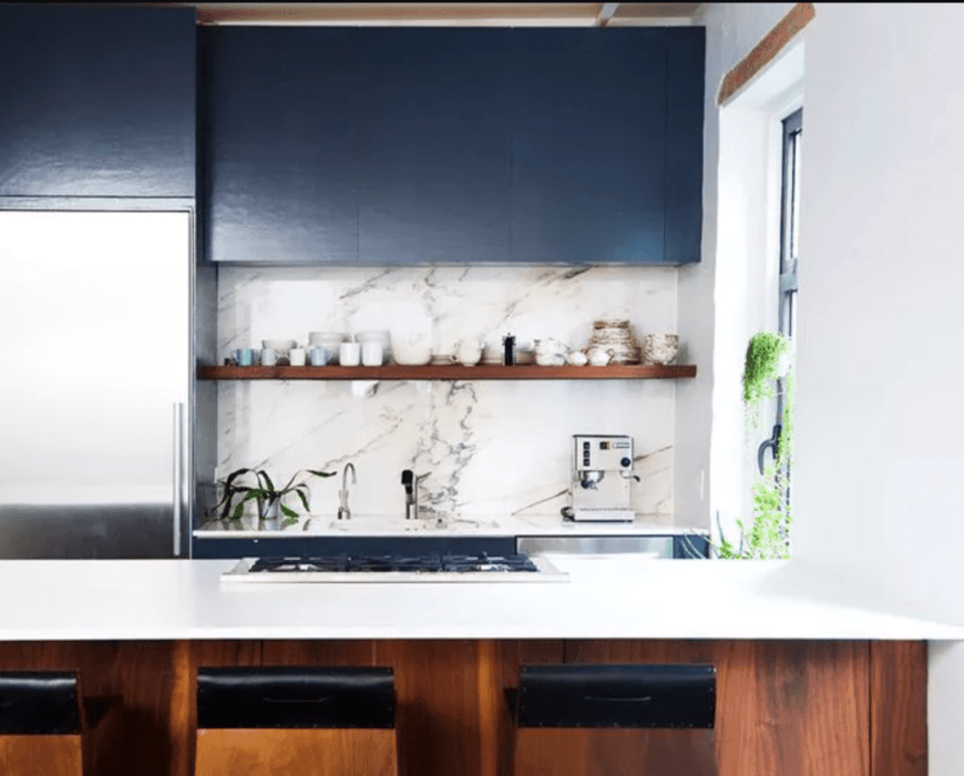 В этом случае барная стойка будет служить дополнительной рабочей поверхностью и выполнит функцию зонирования.