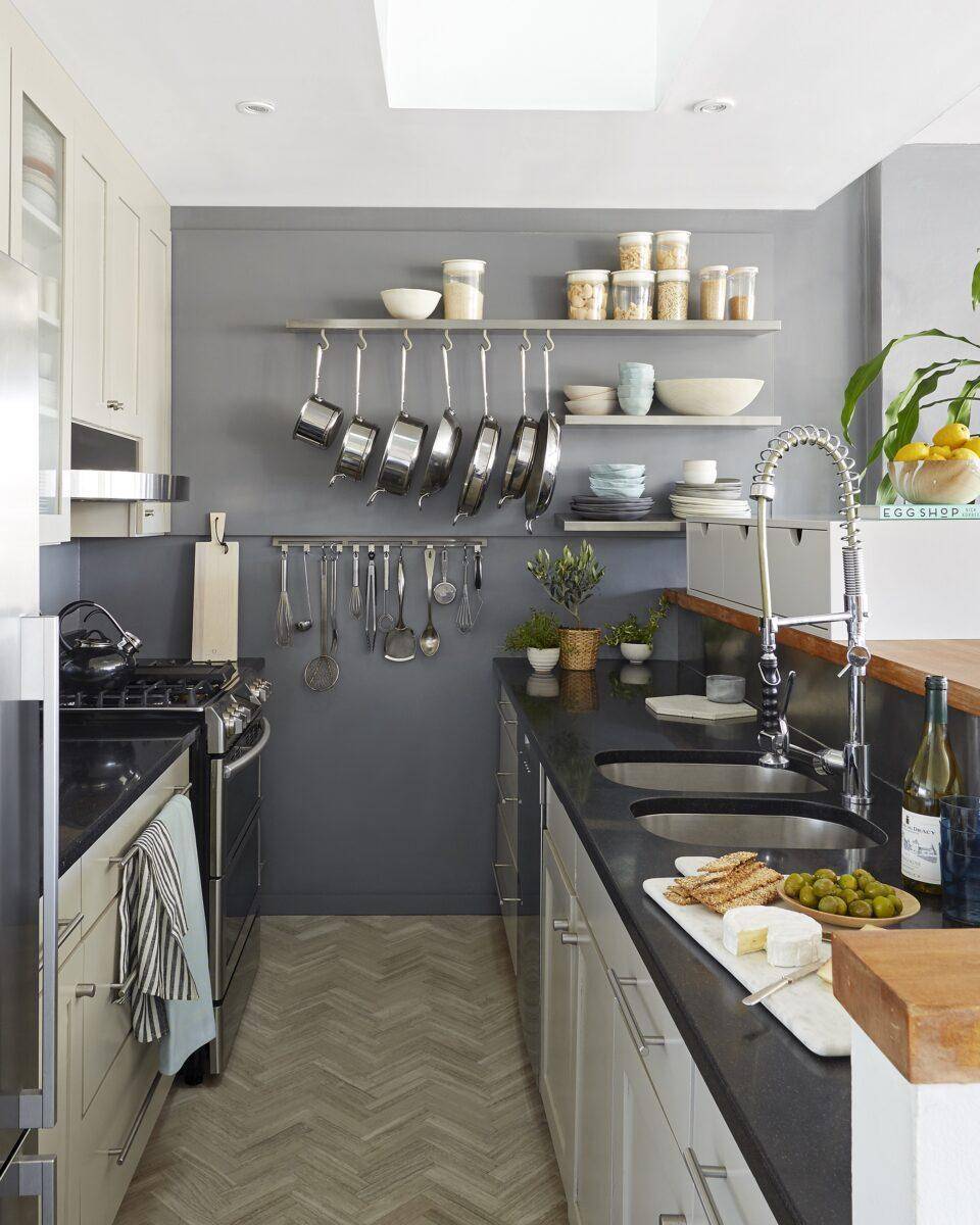 Чтобы сэкономить место, один из рядов шкафов при параллельной планировке можно сделать меньшей глубины – не стандартные 60 см, а, например, 30 см.