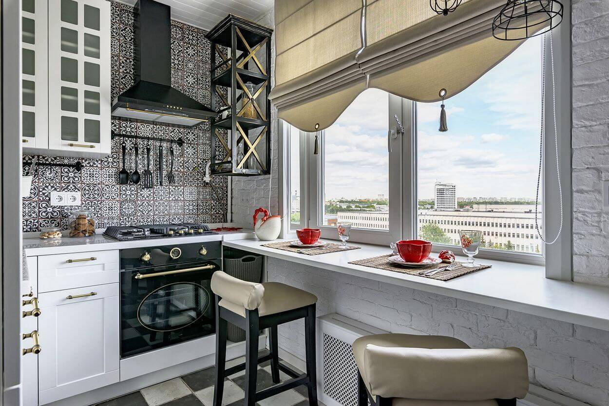 В маленькой кухне будет очень гармонично и функционально, если столешница, которая установлена вместо подоконника, будет плавно переходить в барную стойку. Тогда получиться достаточно большая обеденная зона.