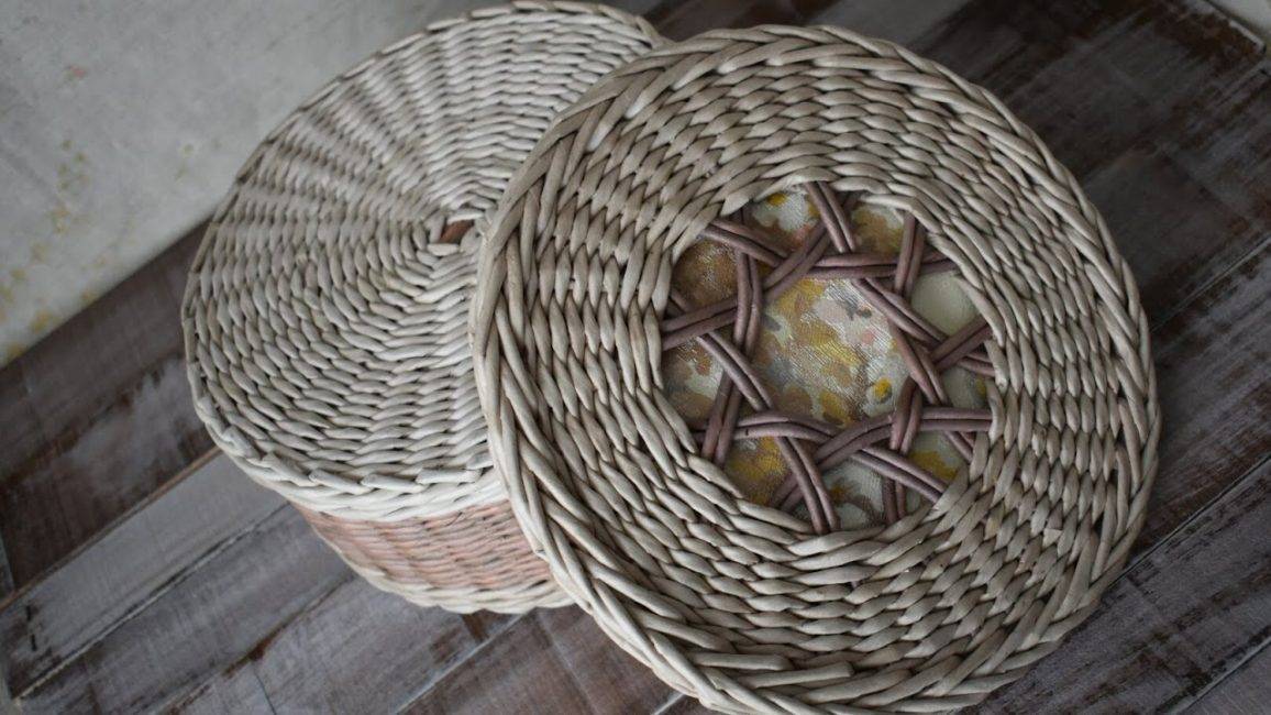 Если корзина плетется открытой, то для нее достаточно изготовить ручки, и она будет готова. Когда предполагается изготовление конструкции с крышкой, то верхнюю часть изделия плетут отдельно. Чтобы самостоятельно изготовить крышку, можно воспользоваться несложным мастер-классом для начинающих.