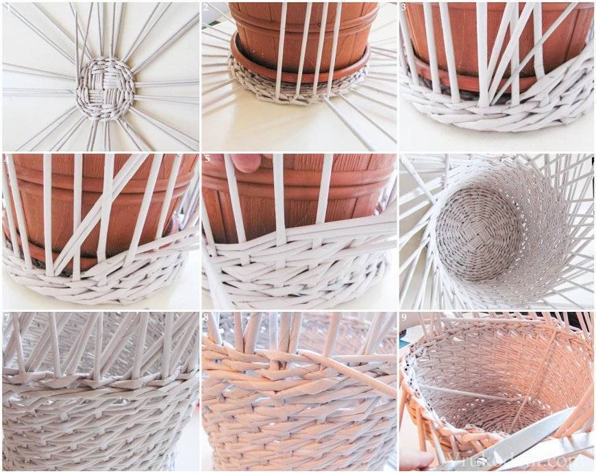 | Плетение дна | Сплетите в указанной технике 6 рядов, оплетая по 3 трубочки сразу, после чего начинайте оплетать по 1 свертке. Так необходимо плести до тех пор, пока не получится дно нужного диаметра. |