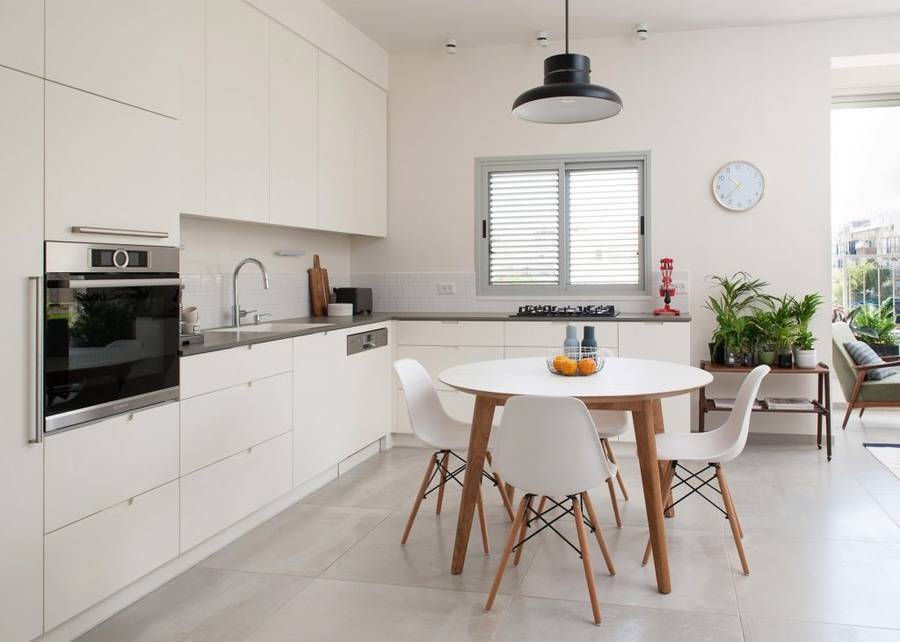 Минималистическая комната и столовая – значит удобство превыше дизайна. При оформлении необходимо использовать однотонные обои и гарнитур, отдавая предпочтение спокойным и теплым цветам. На поверхностях не должно быть лишних деталей. Органайзеры, полки и дополнительные шкафчики помогут освободить пространство. Также не нужно хранить в помещении те вещи, которые редко используются. Минимальное количество посуды и кухонной утвари – залог быстрой уборки и удобства.