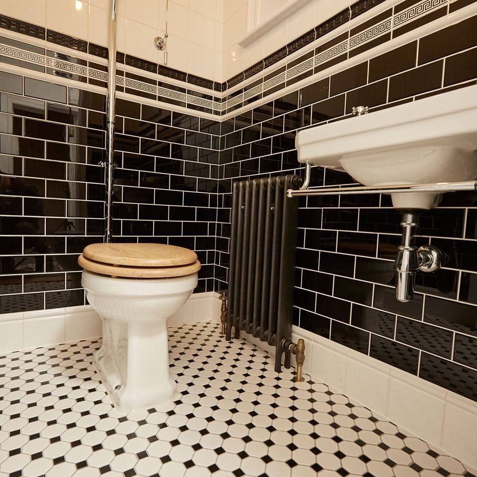 Ограниченное пространство в туалете вынуждает использовать в отделке стен плитку светлых оттенков, хорошо отражающих свет. При этом пол можно отделать черным, дающим ощущение глубины и зрительно увеличивающим объем помещения.