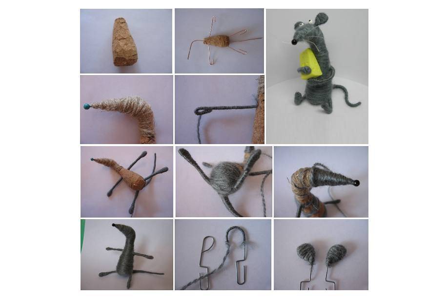 винная пробка, обычные канцелярские скрепки, серая толстая пряжа, клей ПВА, бусинки для глаз и носика, острый нож, термоклей, кусок желтой полимерной глины (сыр).